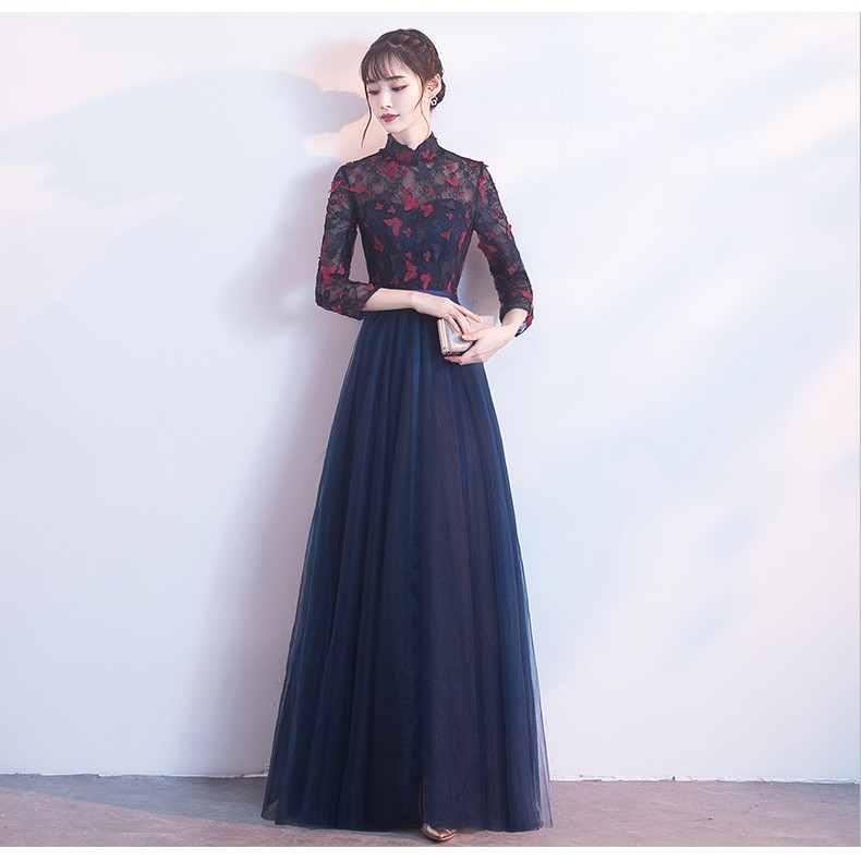 Xs 2xl Navy Blue Muslim Long Sleeve Cheongsams Elegant Wedding Dinner Prom Dress Shopee Malaysia